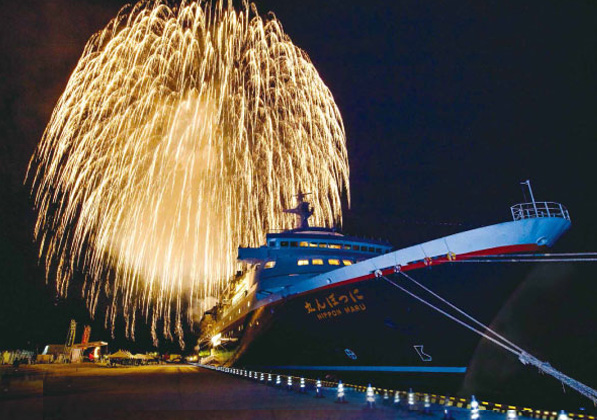 20分間で約16,000発打ち上げられる花火は、まるで夜空から降り注ぐように花開きます。郵船トラベルでは毎年にっぽん丸のチャータークルーズでこの大会を見るクルーズを企画しています。 |