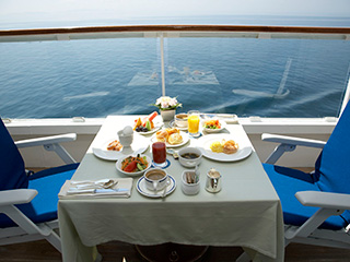 さて、大人の皆さんにクルーズをおすすめする理由のひとつである、細部まで気配りの行き届いた船内空間とその楽しみ方について少しお話ししましょう。客室は全室バス(一部シャワー)・トイレ完備。ソファとコーヒーテーブル、デスク、テレビ、そしてクルージング中でもゆったり休めるベッドがあり、室内だけ見ていると高級ホテルと見紛う設備があります。そしてバルコニーや窓の外に目を転じればそこに広がるのは見渡す限りの水平線と広い空という、非常に贅沢な船内のプライベートスペースです。
