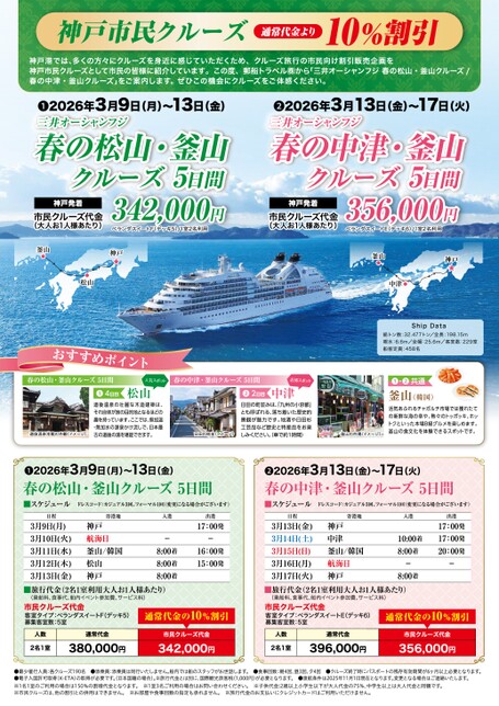 MITSUI OCEAN FUJI 【神戸市民クルーズ】神戸発着 春の松山・釜山クルーズ、神戸発着 春の中津・釜山クルーズ[2026年3月出発]