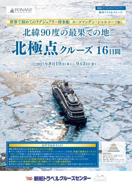 世界で初めてのラグジュアリー砕氷船 ル・コマンダン・シャルコーで航く 北緯90度の最果ての地 北極点クルーズ 16日間<2027年8月19日出発>
