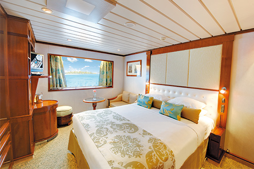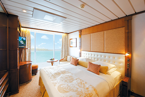 全室オーシャンビューで約70%がバルコニー付。乗客332名に対し、クルー217名で比率は1.5:1ときめ細やかで行き届いたおもてなしを提供しています。そのラグジュアリーなサービススタイルは「オールインクルーシブ」。クルーズ代金には、チップやアルコールを含むドリンク代はもちろん、シュノーケル&フィンセットの貸し出し、カヤックやウィンドサーフィンなどのマリンスポーツも含まれています。