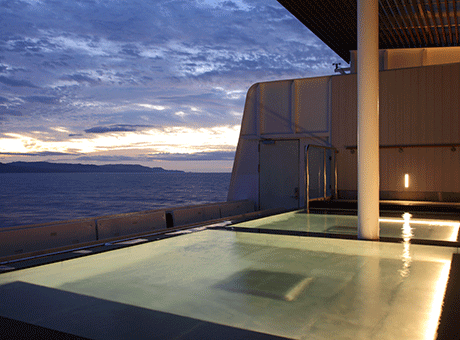 2泊以上のクルーズでは終日航海日を設定。極上の洋上時間を存分に満喫いただけます。プールサイドでくつろぎ、露天風呂でまどろむ至福のひととき。旬の味覚を生かした料理や華やかなショー、さまざまな船内プログラムで新しい世界が広がります。