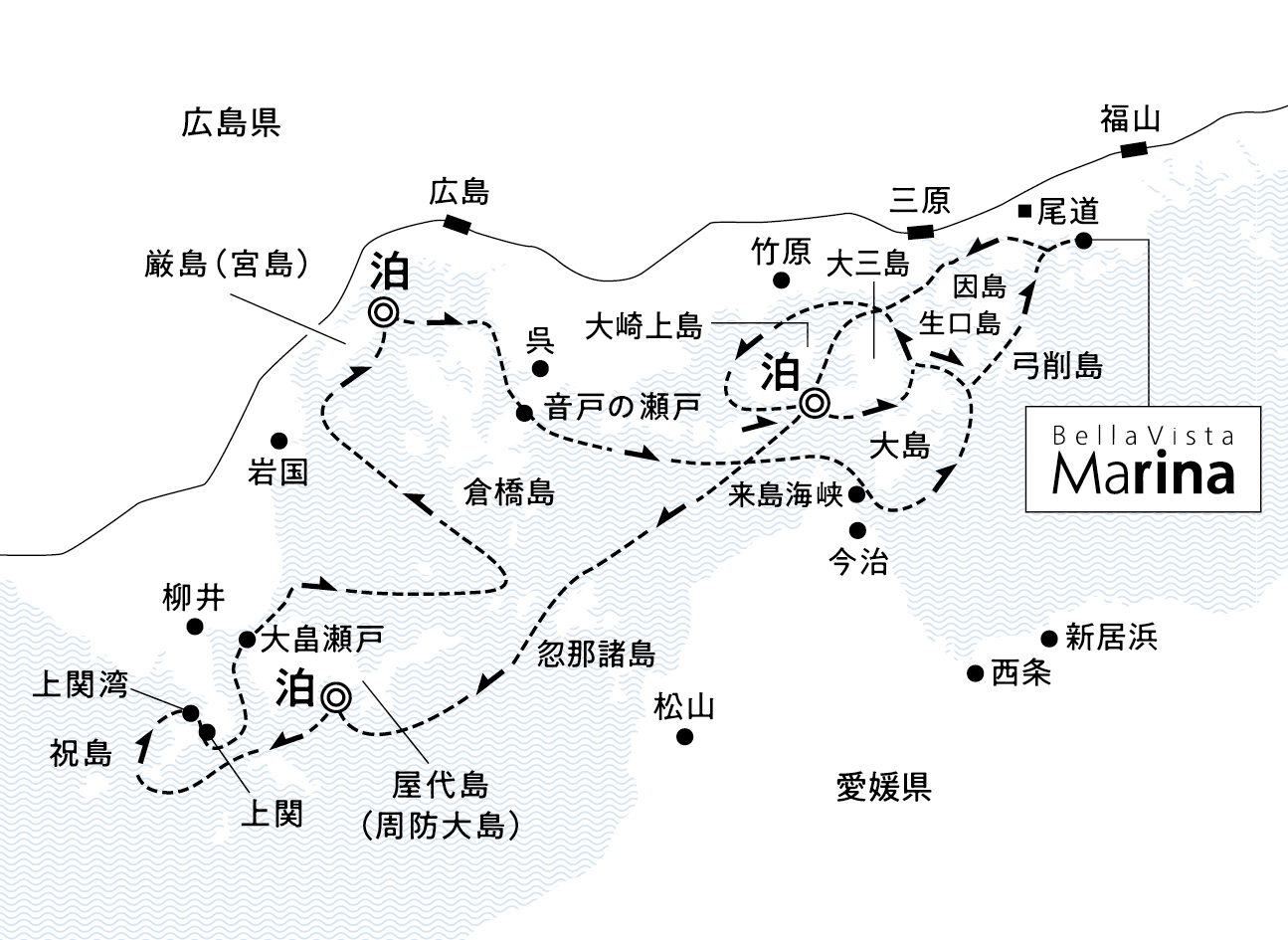- [尾道水道]→[大久野島]→[斎灘]→[忽那諸島]