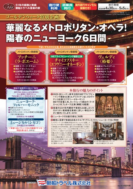春到来! 華麗なるメトロポリタン・オペラ! ニューヨーク 6日間華麗なるメトロポリタン・オペラ! ニューヨーク 6日間<2024年3月13日出発>